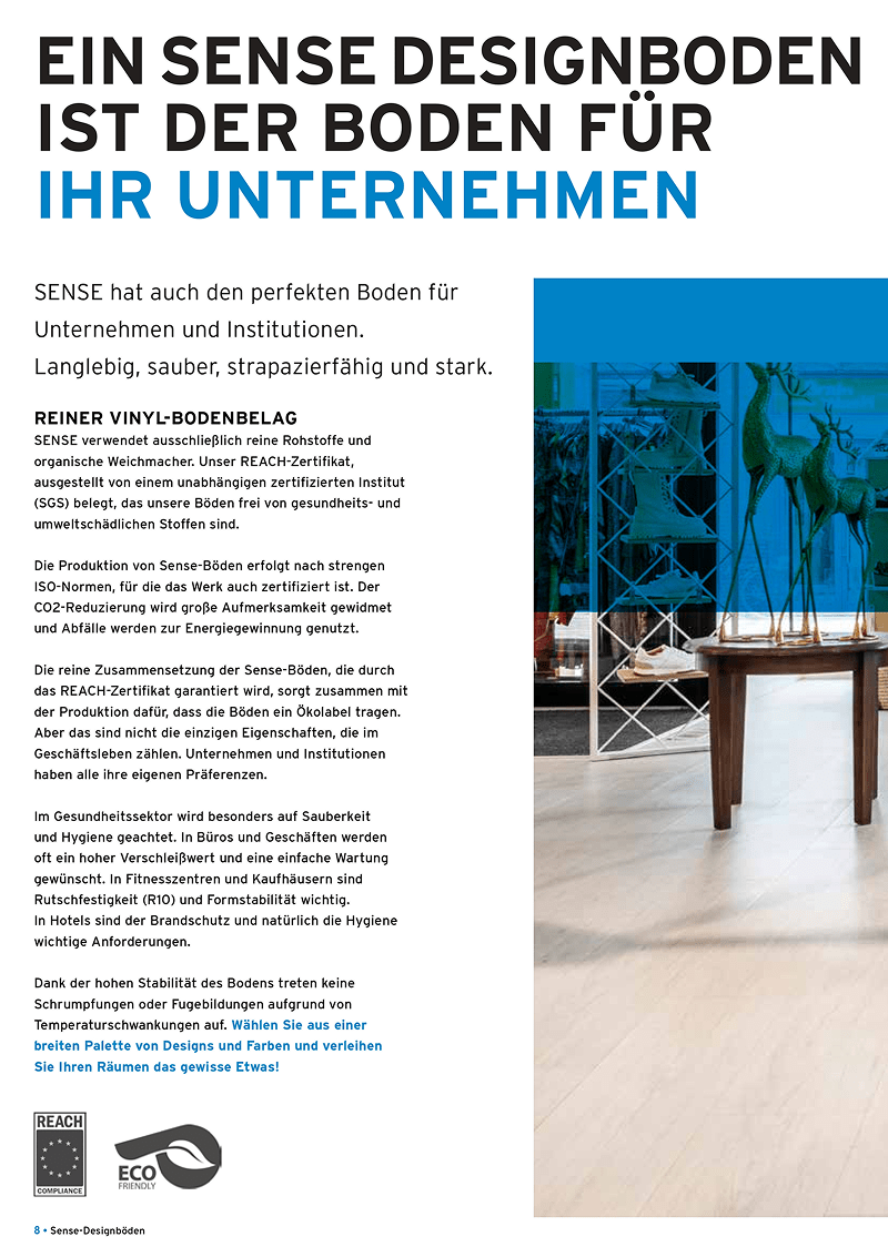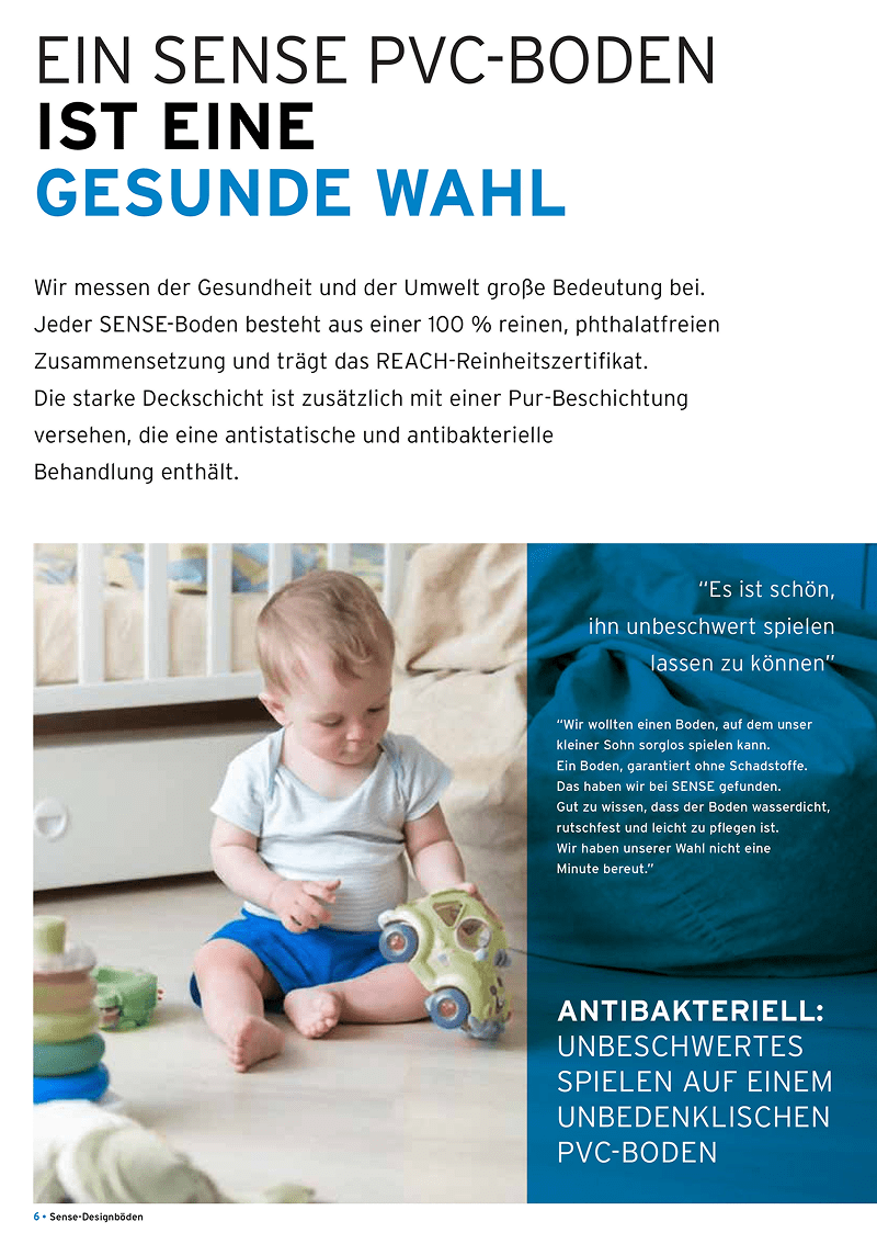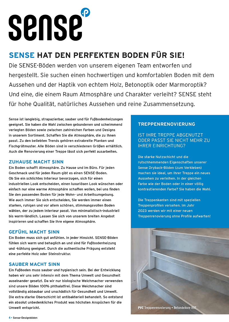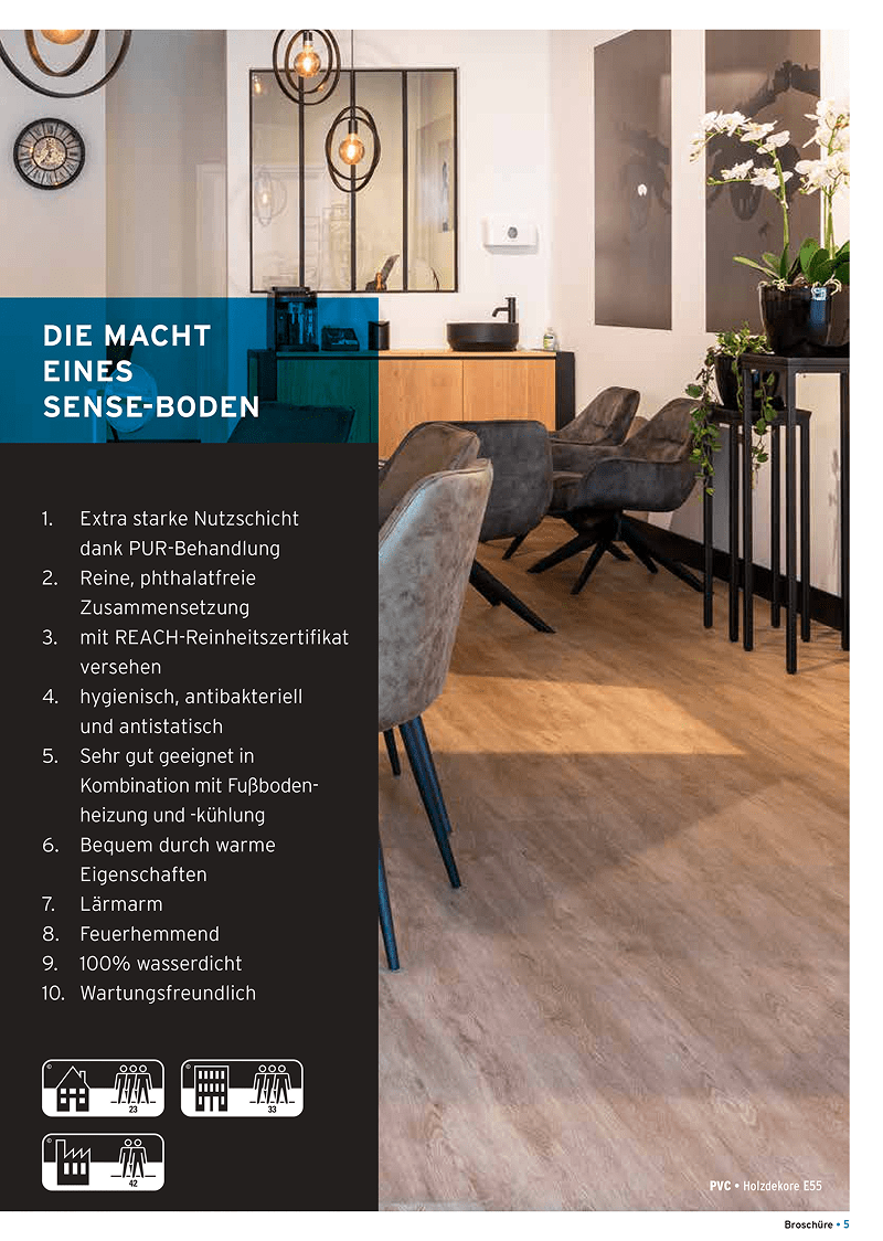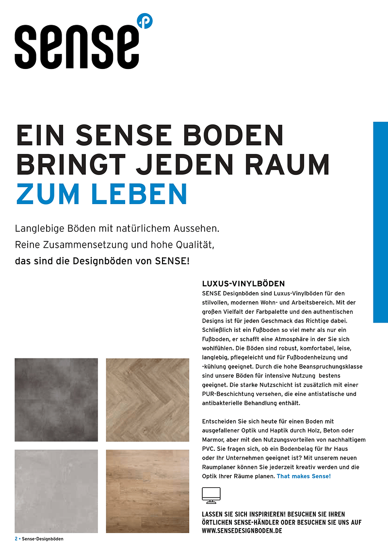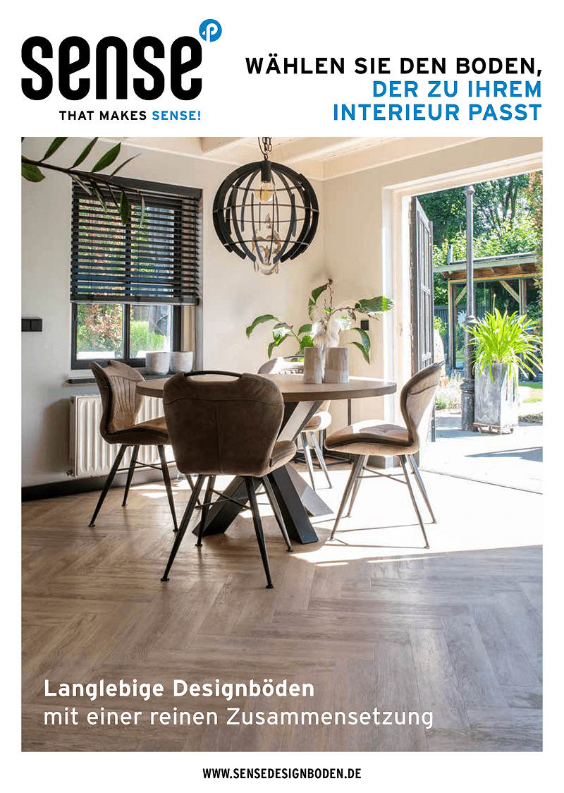 Ein hochwertiger und komfortabler Boden in Echtholz- oder Natursteinoptik? Zuverlässig, schalldämmend, wasserdicht, langlebig, hygienisch und umweltfreundlich? Wir bieten passende Böden für jedes Wohn- und Arbeitsumfeld. Sehen Sie sich unsere kostenlose digitale Broschüre mit allen Informationen zu Sense PVC Flooring und den Möglichkeiten an.